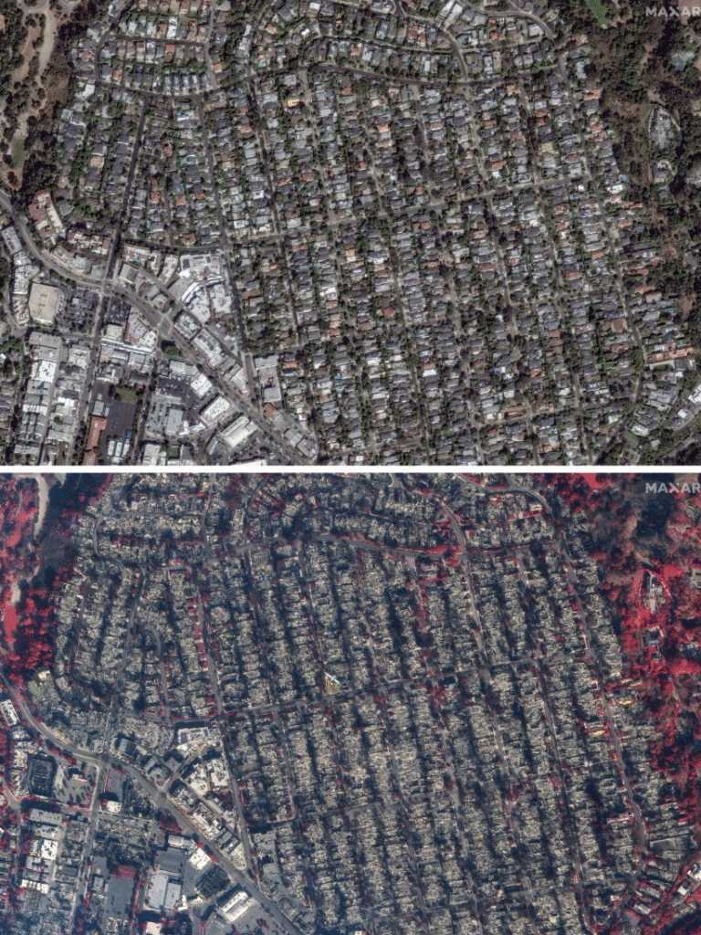 Photo of Pacific Palisades before the Palisades (above), and below the aftermath of the Palisades Fire.