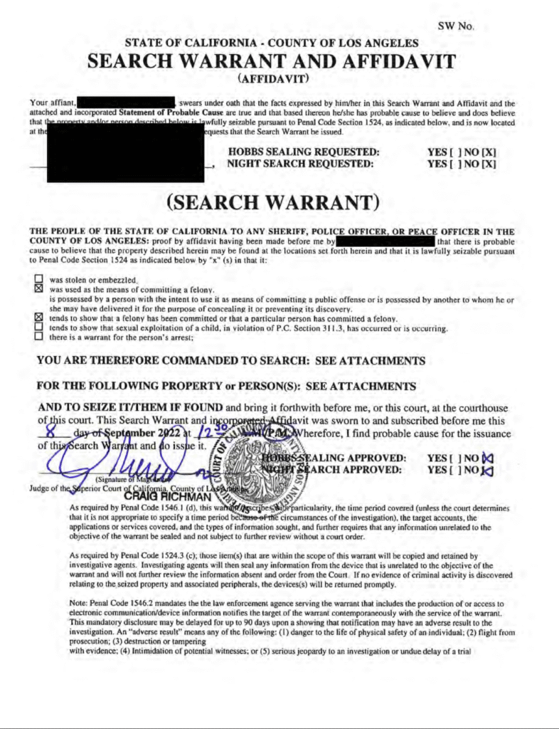 On September 8, 2022, Judge Craig Richman authorized a series of search warrants targeting Metro headquarters, Peace Over Violence’s Wilshire Boulevard offices, and the County Inspector General’s division. Investigators cited probable cause for misappropriation of public funds, alleging that Kuehl had steered a no-bid Metro hotline contract to her friend Giggans.
