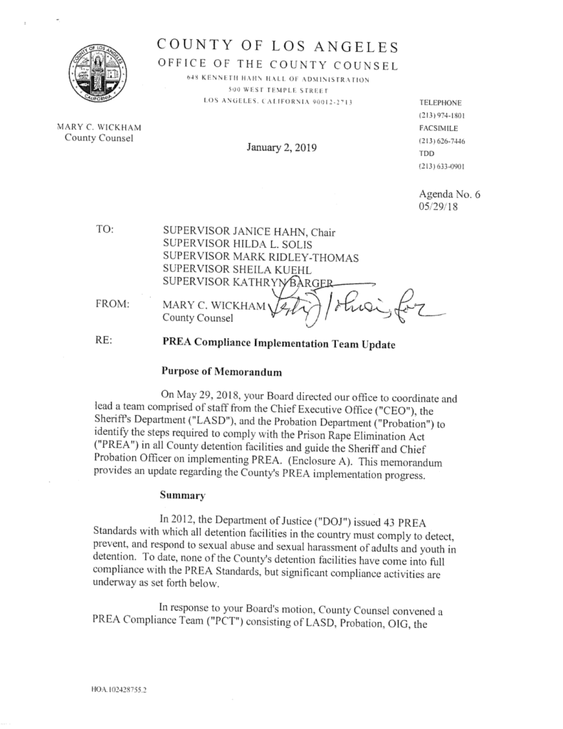 A January 2, 2019 memo from County Counsel Mary C. Wickham lays bare how Peace Over Violence was quietly inserted into the PREA framework without competitive bidding. Weekly meetings, bi-weekly briefings, and direct oversight by the Board occurred while Kuehl sat in plain view – publicly championing “women’s safety” as her close friend’s nonprofit reaped the financial rewards.