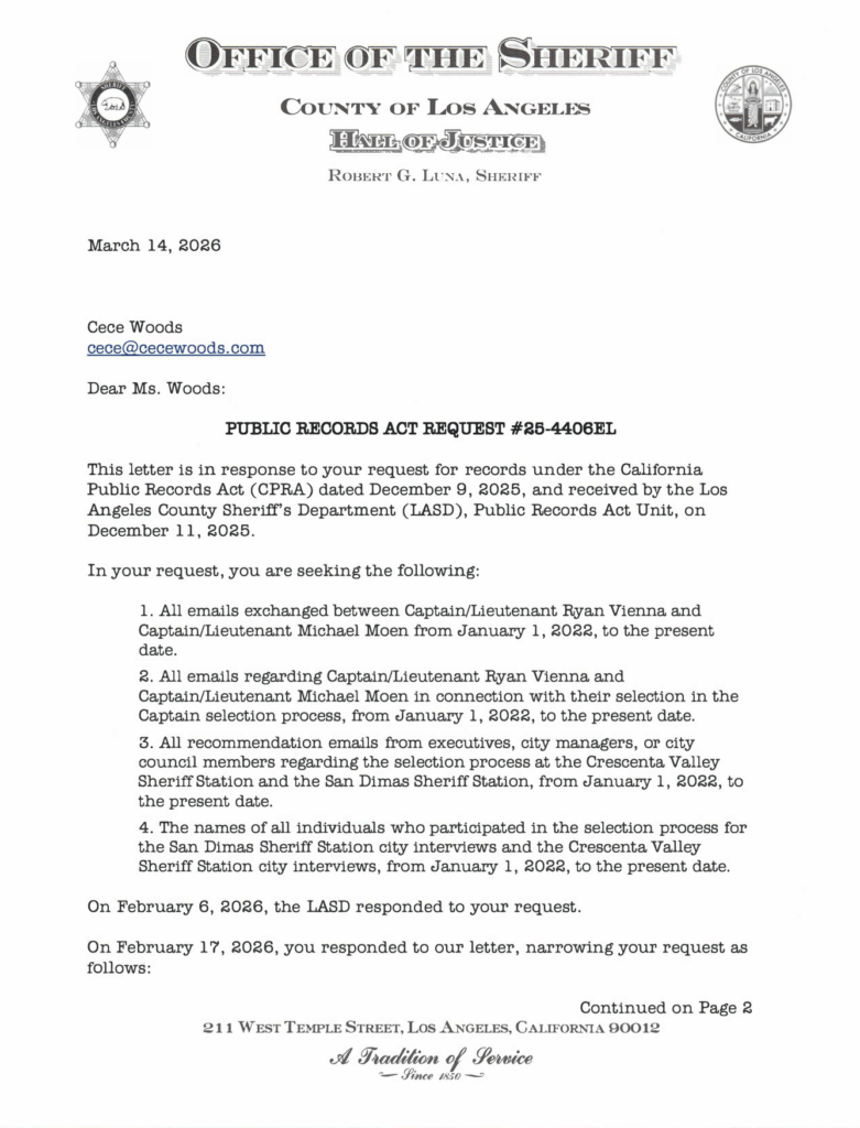 Redactions and missing communications have further complicated the search for answers. Some records appear partially withheld, while others contain extensive deletions. Critics view the pattern as an effort to obscure how these decisions were made. The situation mirrors broader transparency issues that have surfaced during Luna’s tenure, including federal indictments involving individuals connected to his political donors and ongoing litigation related to deputy gangs.