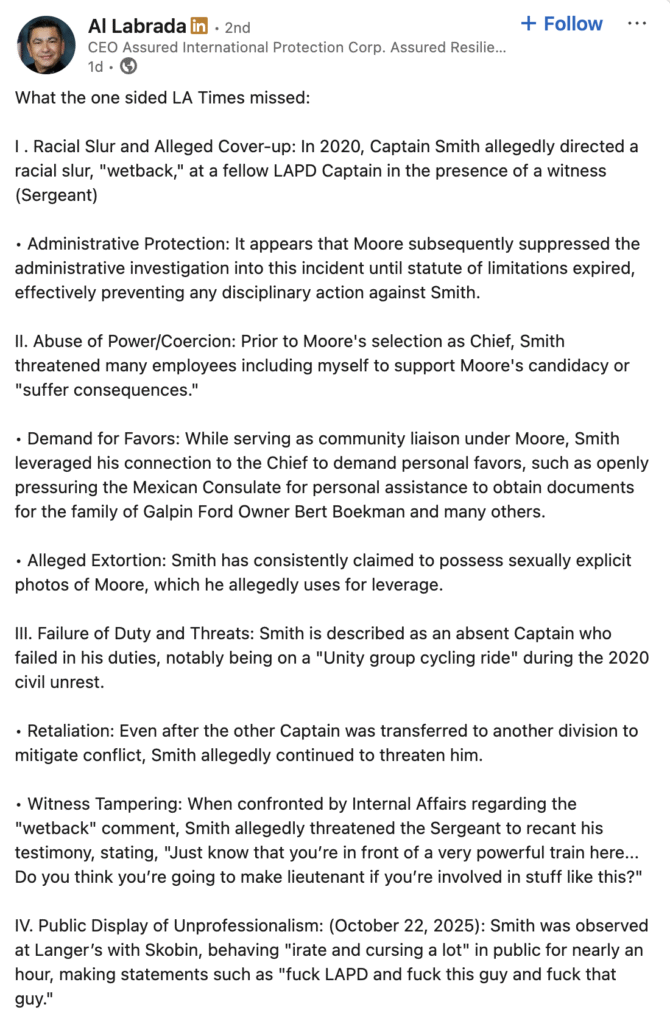 The story neatly, and conveniently, sidestepped the people who actually lived the chaos – and now former LAPD Assistant Chief Al Labrada is now calling out them directly, taking to his social media to publish the true facts in the case: a years-long pattern of retaliation, buried investigations, and top-down protection surrounding a single LAPD Captain who wielded so much unchecked power that even the department’s own command staff privately admitted he had become “an uncontrollable monster.”