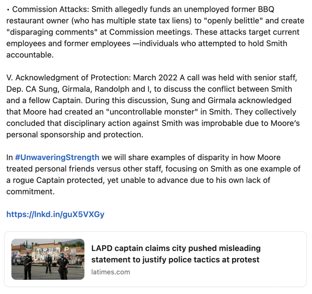 And then comes the moment that underscores everything Labrada is now putting on the record. In March 2022, a conference call with Deputy City Attorney Sung, Assistant Chief Girmala, Commander Randolph, and Labrada took place to address ongoing conflict between Smith and another Captain. On that call, Sung and Girmala openly acknowledged that Moore had “created an uncontrollable monster” in Smith. They further admitted that disciplinary action was “improbable” because Smith was Moore’s protected confidant.