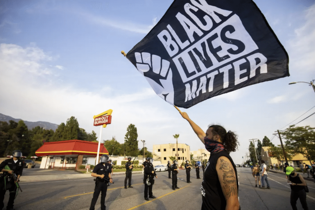 A supporter for Black Lives Matter waves a flag while facing a line of LAPD officers block the two sides of demonstrators from interacting. (Brian Feinzimer)