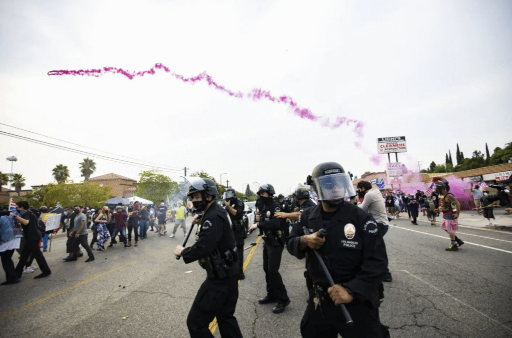 LAPD officers attempt to hold a scrimmage line as supporters of Black Lives Matter and supports of President Trump face off. (Brian Feinzimer)