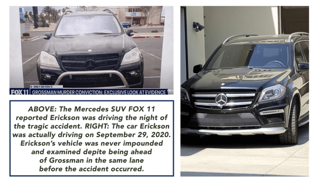 The vehicle issue grows even darker when you account for the two-SUV discrepancy. Erickson owned two black Mercedes SUVs, including a 2007 ML450 with a front metal bumper guard and a 2016 GLC63 AMG. Erickson reportedly represented to authorities that he was driving one vehicle that night, while later reporting indicates he was actually driving the other. If he lied about which SUV he drove, then the reason is obvious. He wanted to steer investigators away from a vehicle that could contain evidence.