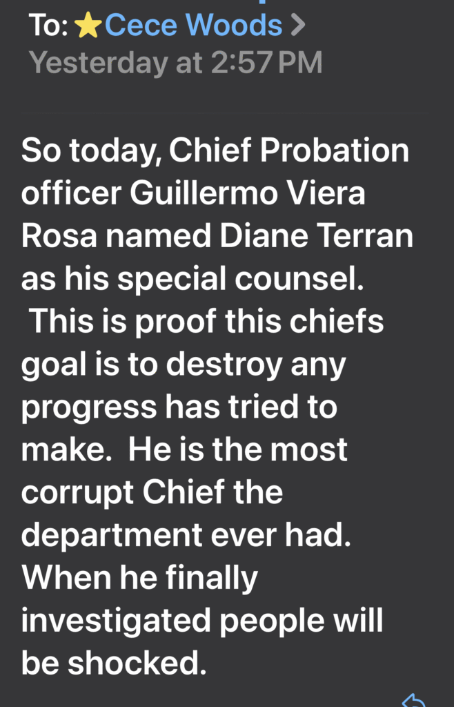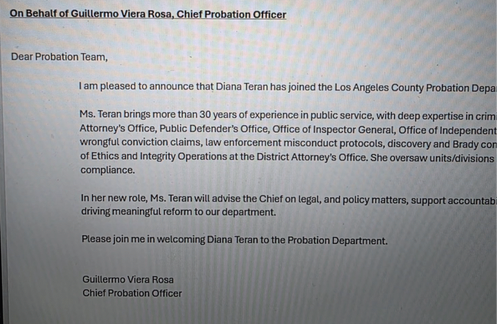 An internal message now circulating confirms that Chief Probation Officer Guillermo Viera Rosa has named Diana Teran as his special counsel. The reaction inside the department was immediate and visceral. The message did not read like routine personnel news. It read like an alarm. To many inside County government, the appointment was not a step forward, but a warning sign that whatever progress Probation had attempted to make was being deliberately reversed.