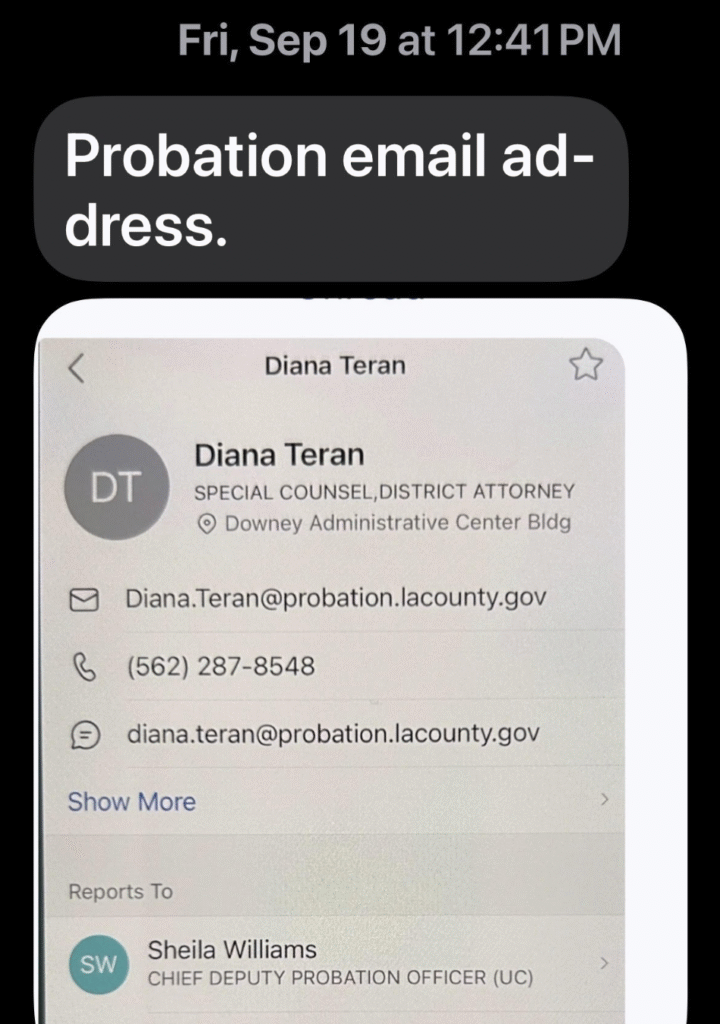 Rather than stepping away from public authority, Teran has resurfaced inside one of the County’s most powerful and sensitive agencies. Sources confirm that her Probation Department email account was active as of mid-September, weeks before her appointment quietly became public. This was not a last-minute hire. It was a calculated reintegration.