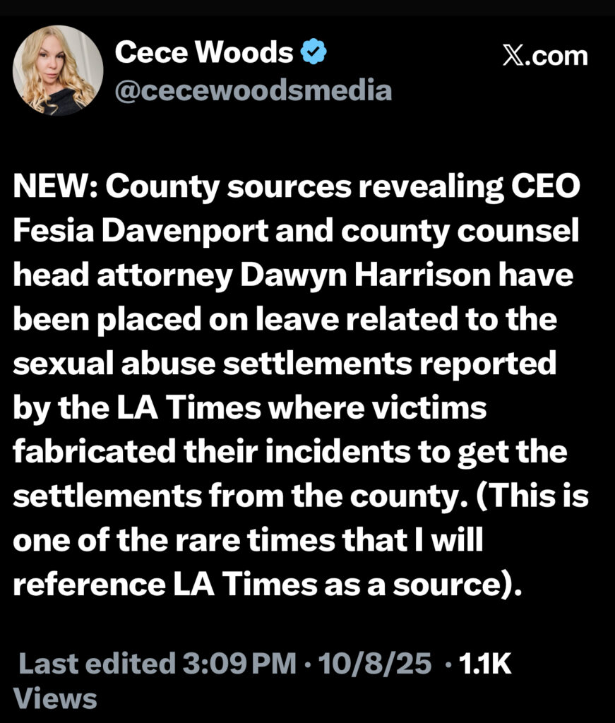 Fast-forward to 2025, and the corruption template remains intact. The Current Report broke the story on X regarding LA County CEO Fesia Davenport was abruptly placed on leave shortly after Los Angeles County supervisor Katheryn Barger has called for a formal investigation into the $4 billion settlement over alleged sexual abuse in juvenile detention, citing concerns that many claims may be fraudulent. Sources say county counsel head attorney Dawyn Harrison was also placed on leave potentially connected to the investigation.