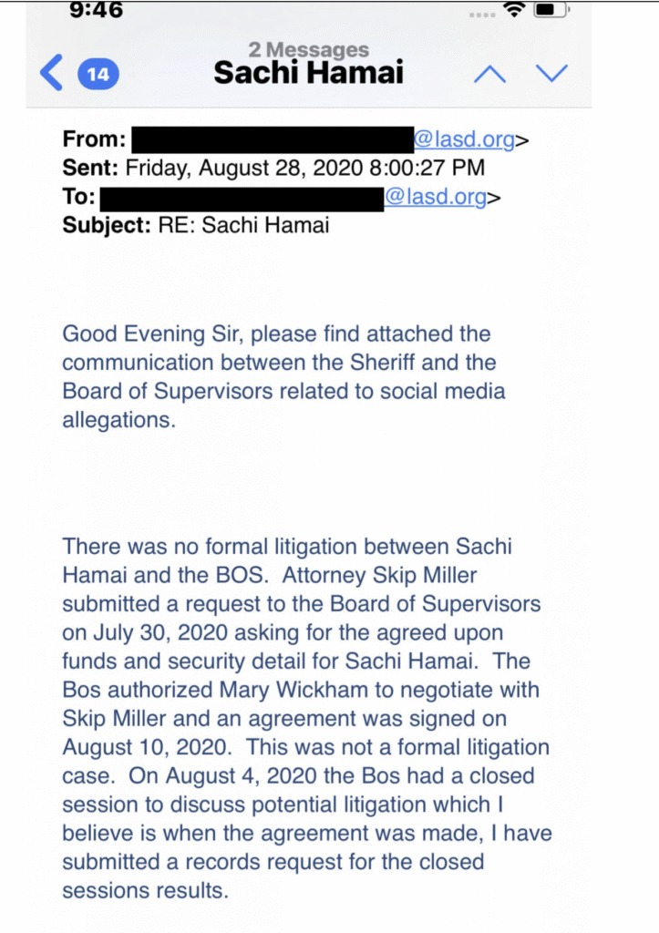 Weeks later, an anonymous source provided the Sheriff’s Department a confidential letter written by attorney Louis “Skip” Miller of Miller Barondess LLP, outlining a secret $1.5 million “combat pay” settlement for Hamai. The payment, justified as compensation for “emotional distress and reputational harm,” was negotiated privately and approved by the same Board that had appointed her. Miller represented both the County and Hamai – a blatant conflict that Villanueva described as a likely ethics and fiscal abuse.