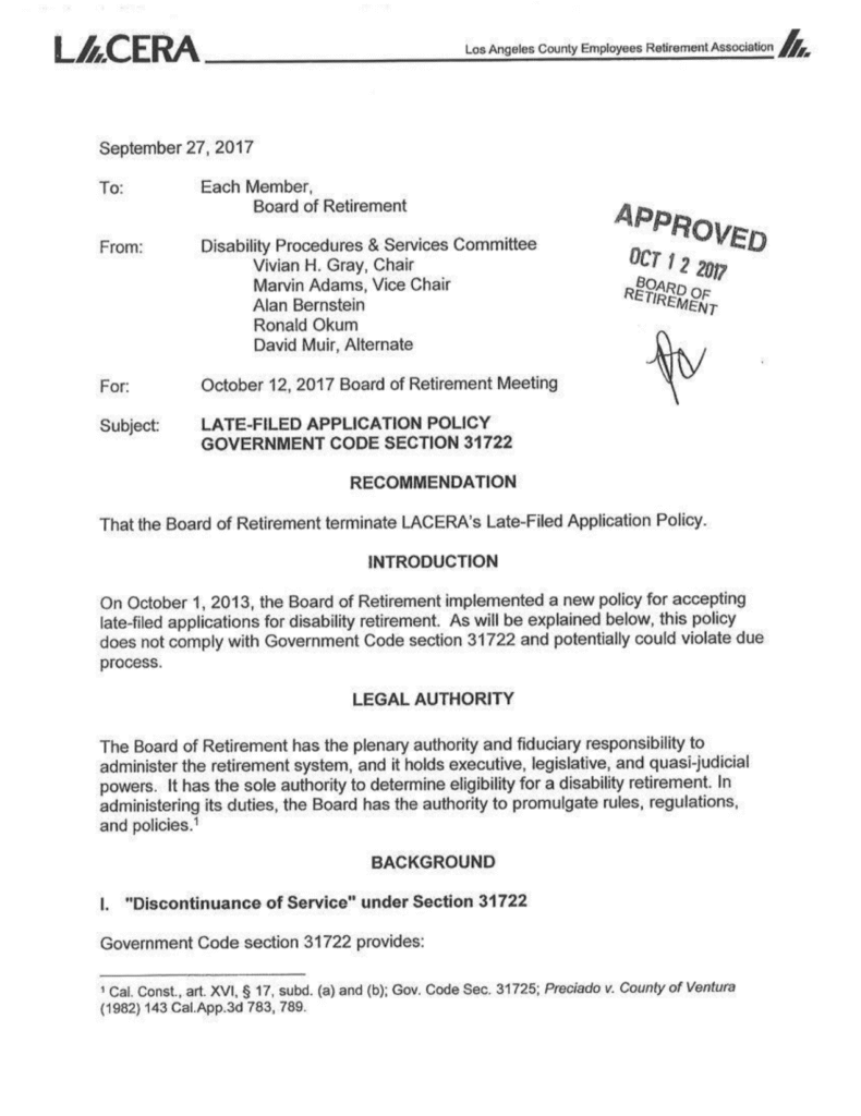 From the outset, Renko’s file reveals an agency that cannot, or will not, abide by its own rules. LACERA’s Electronic Signature Policy demands verifiable signatures. Its Conflict of Interest Code requires neutrality. Its procedures call for precise documentation and factual accuracy. Yet Renko’s administrative file reads like a patchwork of manufactured reality, altered filing dates, computer-generated signatures, and unexplained inconsistencies that directly violate LACERA’s internal standards. Even more damning, a 2017 LACERA legal memo openly admitted the agency had been misapplying Government Code § 31722 for years. The statute is clear that a disability application hinges on the last day of compensation. Renko’s was November 25, 2016. LACERA ignored that and processed the application as if it occurred months later, warping the legal threshold required to approve his claim.