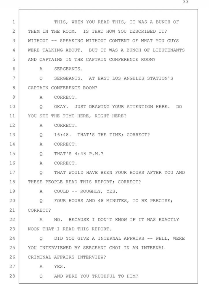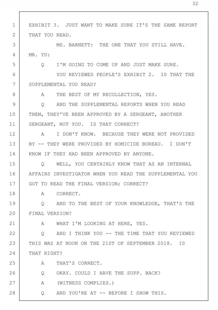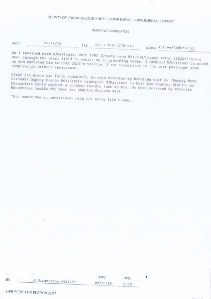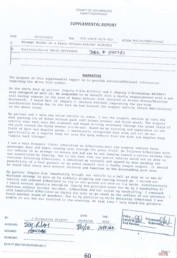 Enter Lt. Amber Mullings, then a sergeant with Internal Affairs Bureau (IAB), and her partner, Sgt. Calvin Mah. Mah did not testify in the trial he was promoted to captain of the Major Crimes Bureau. During the trial, Mullings testified under oath that she reviewed the deputies’ supplemental reports around noon on September 21, 2018, in a meeting with other sergeants at the East L.A. station. She claimed this review revealed inconsistencies that pointed to a cover-up. Lt. Mullings told the jury that she believed at that very moment the two deputies had lied in their reports. But here’s the smoking gun: the report in question from Deputy Miramontes, which was labeled as People’s Exhibit 2, wasn’t approved and signed off until 4:48 p.m. that day, a full four hours and 48 minutes later. How could Mullings have reviewed a “final” version that didn’t exist yet? This isn’t a minor slip; it’s a blatant lie, sworn before a jury, that undermines the entire case.