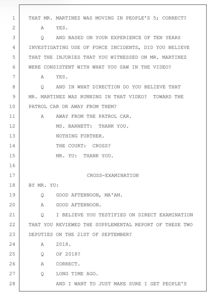 This case stems from a high-stakes pursuit on September 19, 2018, when Deputies Kim and Miramontes responded to an assault with a deadly weapon call involving suspects in a black BMW who had threatened a motorist with a gun. The chase ended in Ruben Salazar Park, where a passenger, Hector Mario Martinez, a known gang member, fled on foot. Surveillance video captured the moment Kim’s patrol car door made contact with Martinez, knocking him down, a split-second event in a chaotic scene filled with children and families nearby, not to mention a shootout that left two suspects dead and three law enforcement personnel injured. Two deputies were shot as a result of the deputy-involved shooting.