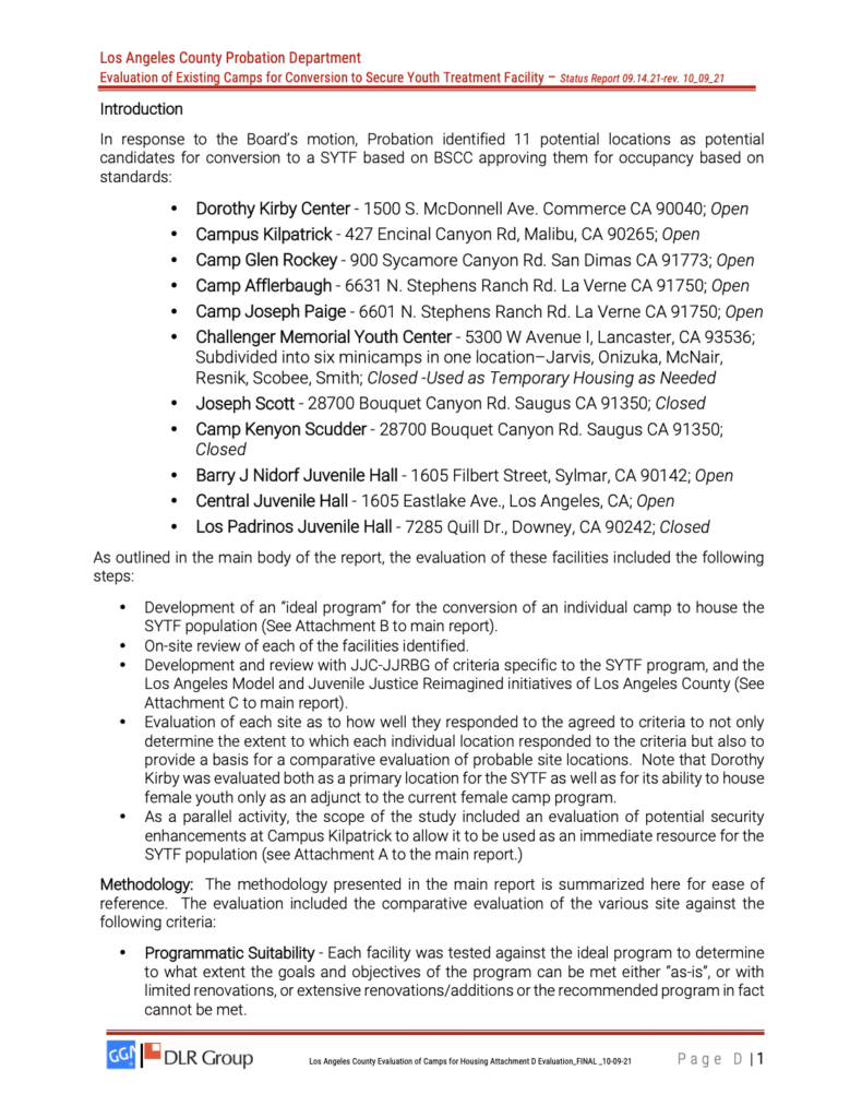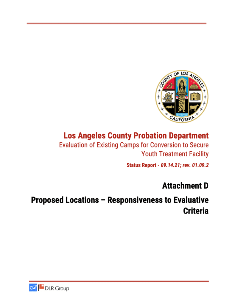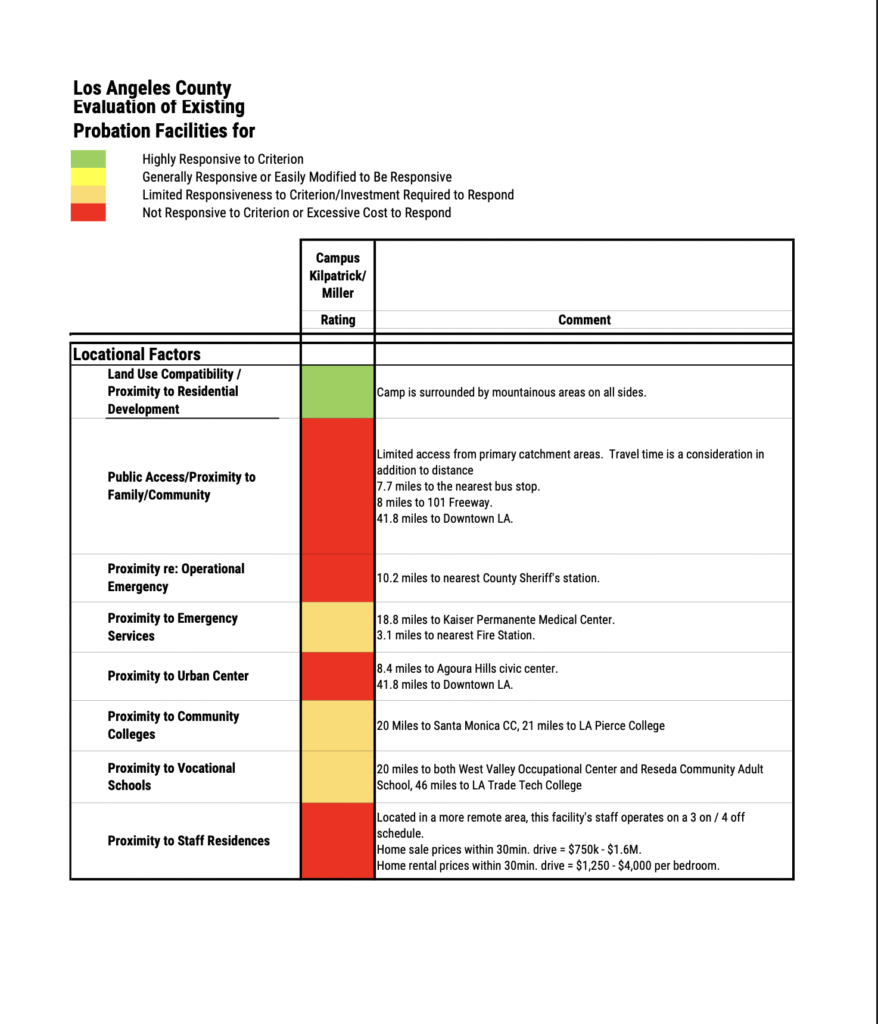 In Los Angeles County, that translated into the Probation Department’s unilateral power to transform Malibu’s open-air sports camp into a locked compound for high-risk offenders. But internal county documents reveal that Kilpatrick fails nearly every suitability test for this purpose. Page D49 of the Probation Department’s evaluation is littered with red flags – literally – marking the site unsafe, impractical, and prohibitively expensive to retrofit. The report cites serious deficiencies in emergency response, staffing, and access.