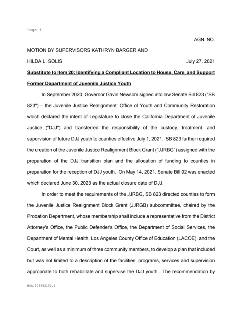 This shift traces directly back to a 2021 Board of Supervisors motion authored by Kathryn Barger and Hilda Solis. The motion, titled “Identifying a Compliant Location to House, Care, and Support Former Department of Juvenile Justice Youth,” was introduced on July 27, 2021, as part of the county’s compliance with Senate Bill 823, Governor Gavin Newsom’s so-called “Juvenile Justice Realignment” plan. SB 823 was meant to close the state’s Department of Juvenile Justice and transfer the responsibility of housing and supervising serious youth offenders to local counties. On paper, the law promised reform, rehabilitation, and community-based reintegration. In reality, it opened the door for counties to quietly reclassify facilities and sidestep the very accountability measures the law was designed to enforce.