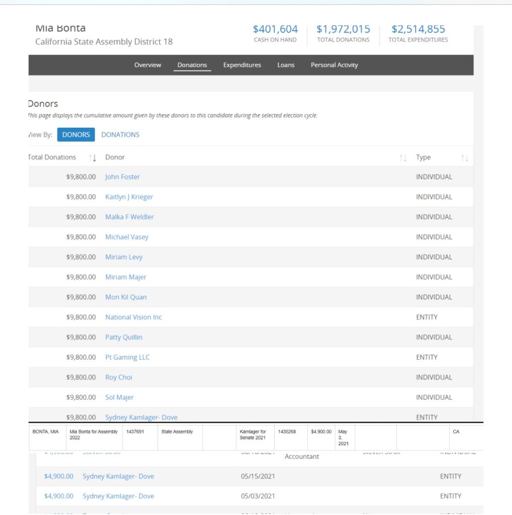 But Dove’s entry wasn’t the only intervention that raised eyebrows. In the weeks following those warrants, Congresswoman Sydney Kamlager-Dove – his wife and Holly Mitchell’s longtime protégé – made two strategically timed campaign contributions totaling $9,800 to Mia Bonta, wife of California Attorney General Rob Bonta, who was then running for State Assembly. At the time, Kamlager-Dove was publicly urging AG Bonta’s office to take over the Kuehl-Giggans investigation from the Sheriff’s Department.