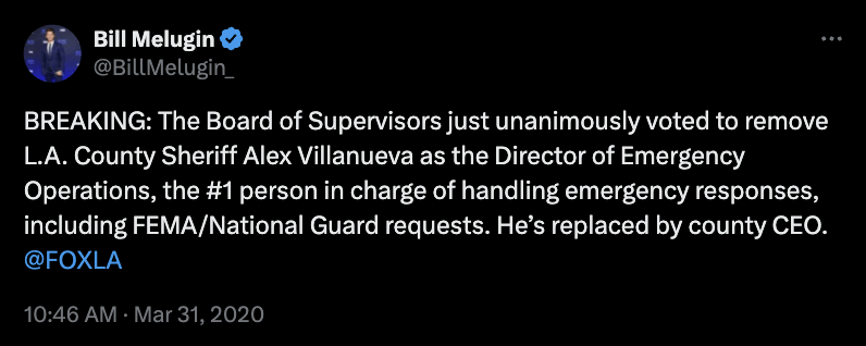 This was not the first wildfire that could have been prevented. The same failed leaders quietly whitewashed the after action reports following the 2018 Woolsey Fire, burying hard lessons instead of fixing the system. Nothing changed. If anything, the county performed worse this time, a staggering regression after years of warnings and promises. However, the incompetence of LA County leaders kicked into high gear in 2020 during the pandemic when the Board of Supervisors quietly stripped emergency management authority from then-Sheriff Alex Villanueva and reassigned it to themselves, routing control through the County CEO. That decision dismantled a structure that had existed for decades for a reason. When the Sheriff held emergency management authority under Villanueva, there were bi annual roundtable meetings involving the Board of Supervisors, the Sheriff, and Los Angeles County Fire. Emergency protocols were reviewed. Resources were assessed. Gaps were identified before crisis struck. It was not flashy governance, but it worked.