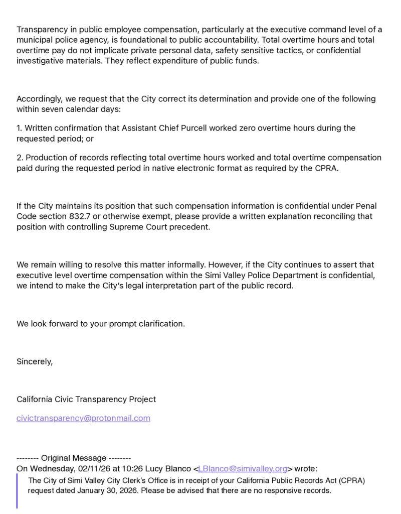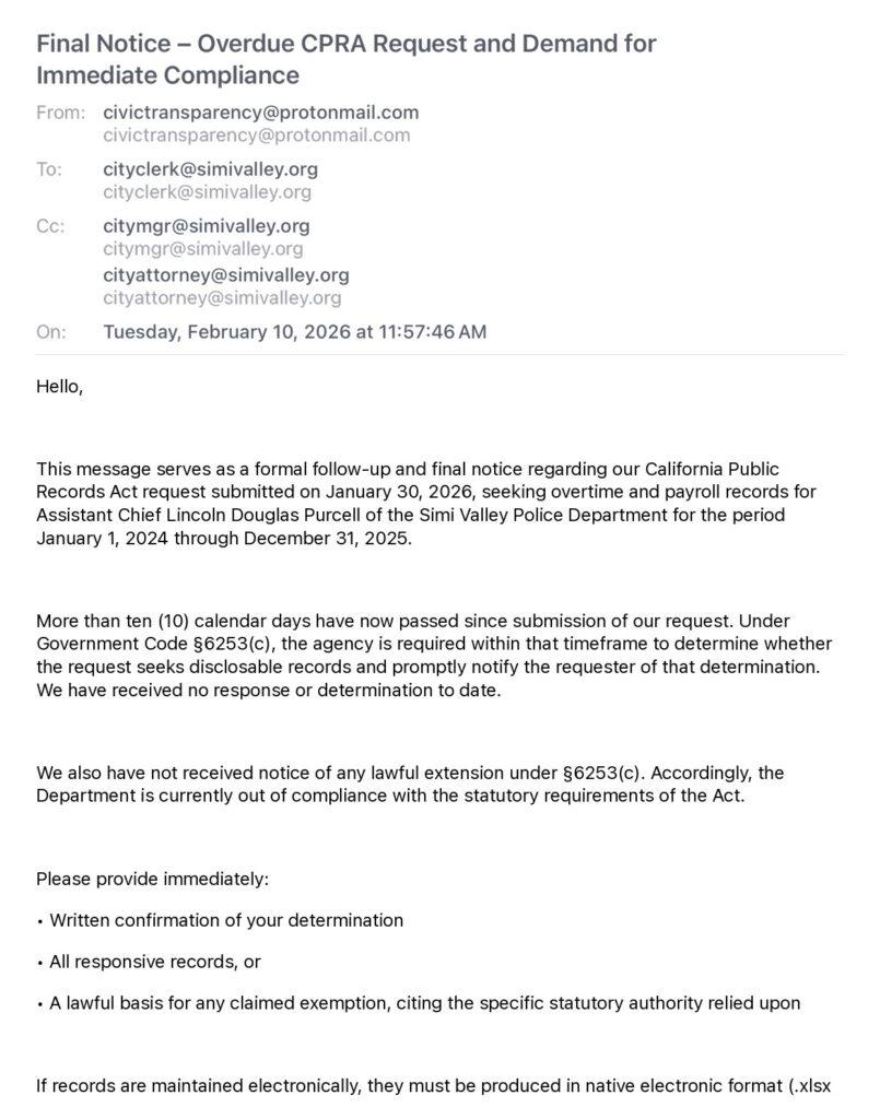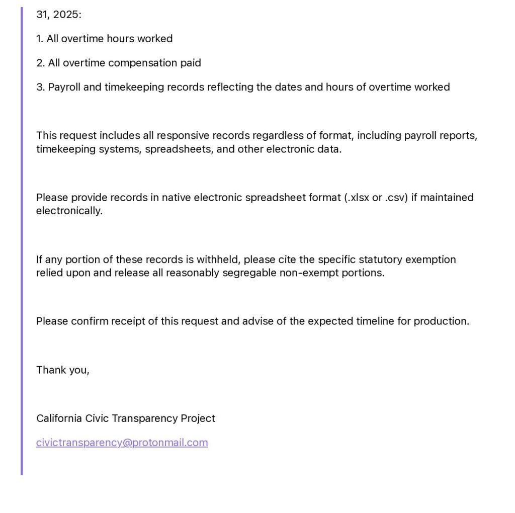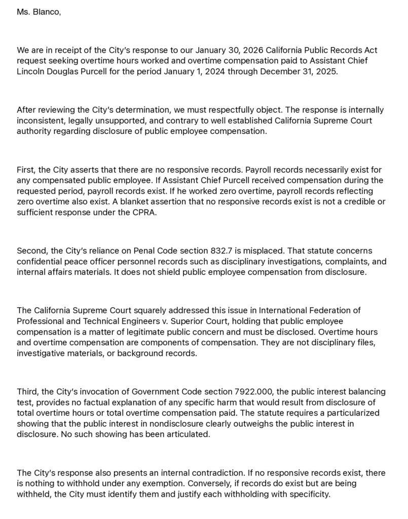 Efforts to obtain additional information have also reportedly been met with resistance. Multiple California Public Records Act requests seeking overtime data and related records have been delayed or denied, according to requesters. The City Clerk’s Office, which handles such requests, operates under the authority of the City Manager, who is described by department sources as a close ally of Assistant Chief Purcell.