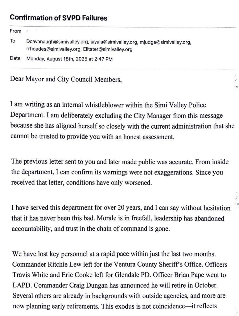 SIMI VALLEY, Calif. – What began as a leadership transition in early 2023 has, according to multiple sources within the Simi Valley Police Department, become something far more serious: a growing internal belief that authority has become concentrated among a small group of senior leaders, while confidence in leadership, oversight and the systems meant to ensure fairness has steadily eroded.