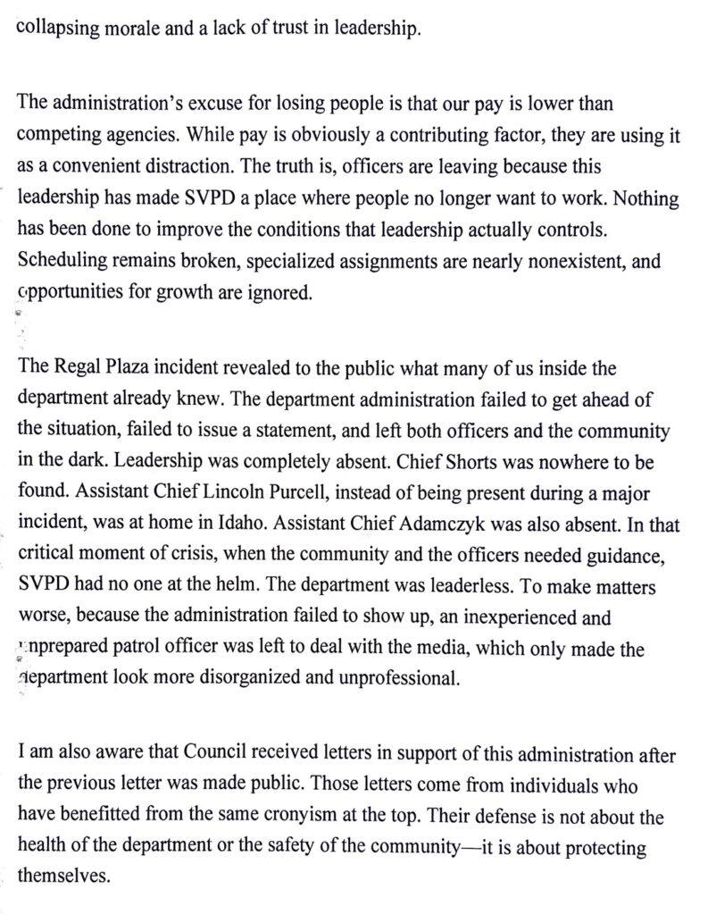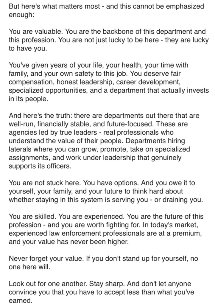 Across interviews, officers consistently described declining morale within the department. Many stated that line-level personnel continue to carry the daily public safety workload while executive leadership operates with broad discretion and limited external scrutiny. Several described an agency in which the people doing the day-to-day work increasingly feel disconnected from, and unsupported by, the leadership above them.