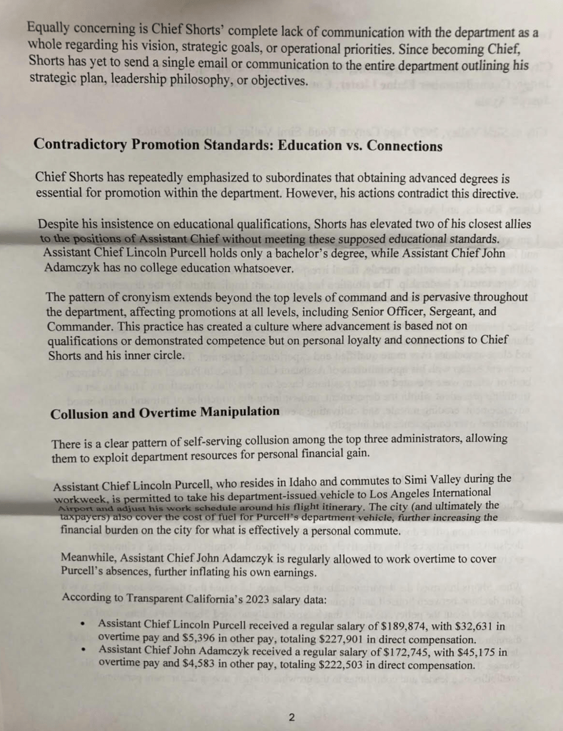 In April 2023, Adamczyk and Purcell were permanently appointed as Assistant Chiefs. The promotions drew additional scrutiny because Chief Shorts had previously emphasized higher education as an important factor in advancement. According to department sources, Purcell holds a bachelor’s degree, while Adamczyk does not have a college education. Both were promoted over more senior candidates, including then-Commander Ritchie Lew, the department’s longest-serving Commander at the time. Officers interviewed described the outcome as inconsistent with those stated standards.