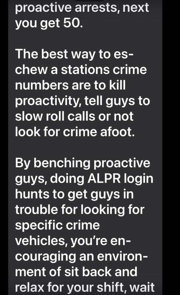 According to multiple internal sources, deputies are being discouraged from proactive policing. Self-initiated stops are frowned upon. License plate reader hits are scrutinized. Looking for stolen vehicles, burglary crews, or suspicious activity is increasingly treated as a liability, not a duty. The safest course of action, deputies are told implicitly and sometimes explicitly, is to sit back, respond only when dispatched, and avoid generating activity that could later become an administrative problem.