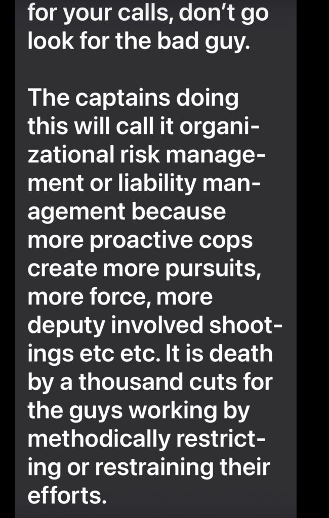 What the public is being sold is a narrative of reform and restraint. What deputies are living under is a culture of risk aversion, administrative fear, and leadership that prioritizes clean statistics over public safety. Arrests are down countywide, not because crime has dropped, but because deputies no longer trust command staff to support them when enforcement leads to scrutiny, discipline, or political fallout.