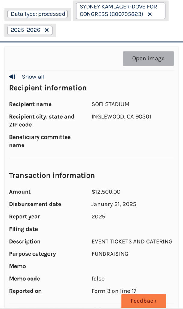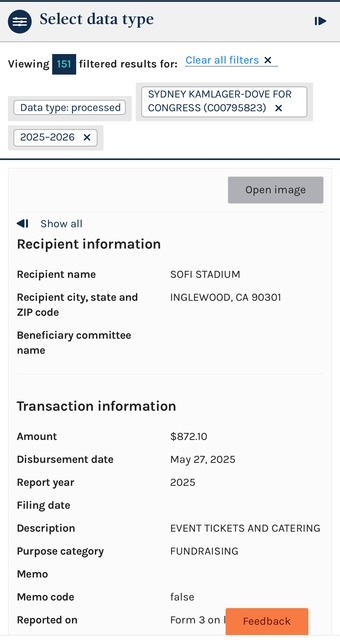 The Current Report has reviewed the payment timestamps and cross-referenced them with SoFi Stadium’s event calendar. The alignment isn’t subtle. The dates match major Rams home games, the Kendrick Lamar tour stop, and even the Beyoncé concerts, all appearing alongside “fundraising” and “campaign event” labels with no public record of an actual political event.
