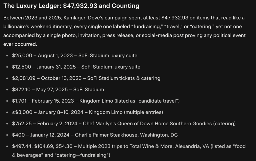 What we have uncovered now makes the Cervantes scandal look like merely the opening scene of a much deeper, more calculated pattern of behavior. A deep review of federal campaign filings from both Rep. Kamlager-Dove’s main committee and her leadership PAC reveals an unmistakable trend: donor money being siphoned into a lifestyle of luxury that has no visible connection to actual campaigning. The receipts tell a story she has worked hard not to tell herself.