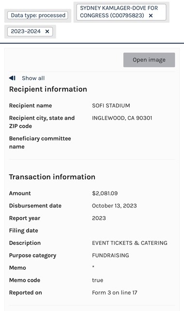 Over the course of 2023 to 2025, nearly forty-eight thousand dollars in donor funds was spent on items that would make a hedge-fund titan blush: SoFi Stadium luxury suites, chauffeured limousines, fine dining, high-end catering, boutique charges, and even liquor runs disguised as “fundraising expenses.” One SoFi suite alone cost twenty-five thousand dollars on August 1, 2023. Another suite, twelve thousand five hundred dollars, appeared in the filings on January 31, 2025. Additional charges for SoFi tickets, catering, and stadium “expenses” appear repeatedly with no trace of an actual political event, no invitations, no donor lists, no photos, no social media posts, and no evidence they were anything other than private entertainment. Thousands more were spent on luxury transportation through Kingdom Limo, restaurant tabs in Washington, DC, catering orders, and multiple liquor purchases at Total Wine. All of it labeled as political activity. None of it supported by a shred of proof.