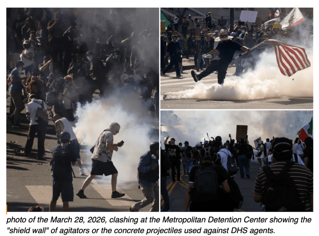 While the morning of Saturday, March 28, 2026, saw a peaceful turnout of nearly 100,000 demonstrators, the afternoon shift toward the Roybal Federal Building marked a significant escalation in agitator tactics. Agitators dismantled concrete barriers near the Metropolitan Detention Center, using the fragments as projectiles. Two federal officers were hospitalized after being struck by concrete blocks. Protesters reported skin burns from tear gas and one significant eye injury from a pepper ball.