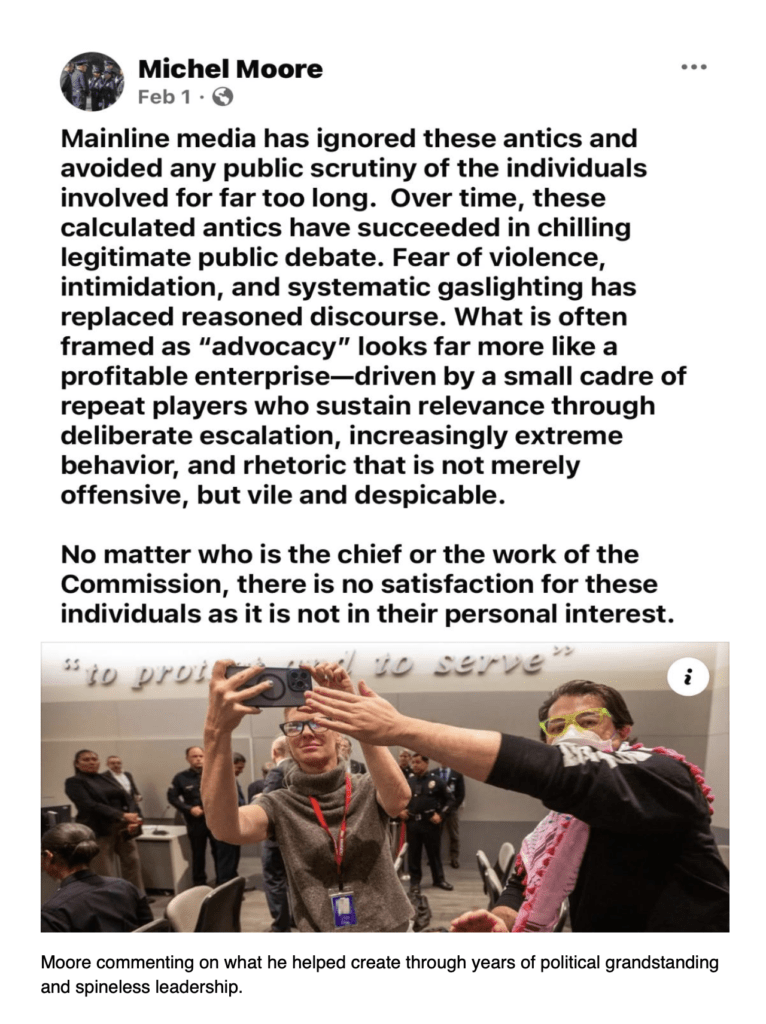 We created these monsters. By treating chronic agitators as “stakeholders” rather than professional disruptors, the Department validated their tactics. Most disturbingly, we now see some Los Angeles Police Department command staff acknowledging and condoning these street terrorists, even using them to belittle and scream at their own rank-and-file officers. When leadership empowers the very people who want to dismantle the Department, the chain of command has switched sides.