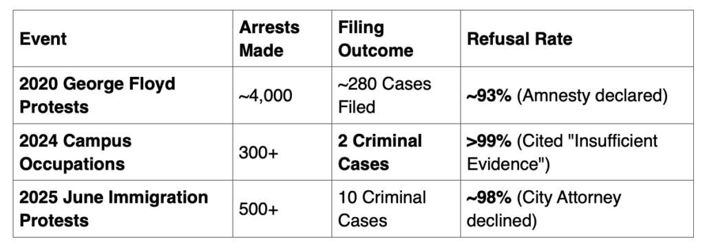 City Attorney Hydee Feldstein Soto remains the biggest variable. Historically, her office has been a “filing graveyard” for mass-arrest misdemeanors. If she repeats her 2025 pattern, where she declined more than 300 cases from campus protests, the 66 “failure to disperse” arrests from Saturday will likely be dismissed or reduced to “office hearings” with no lasting consequences.