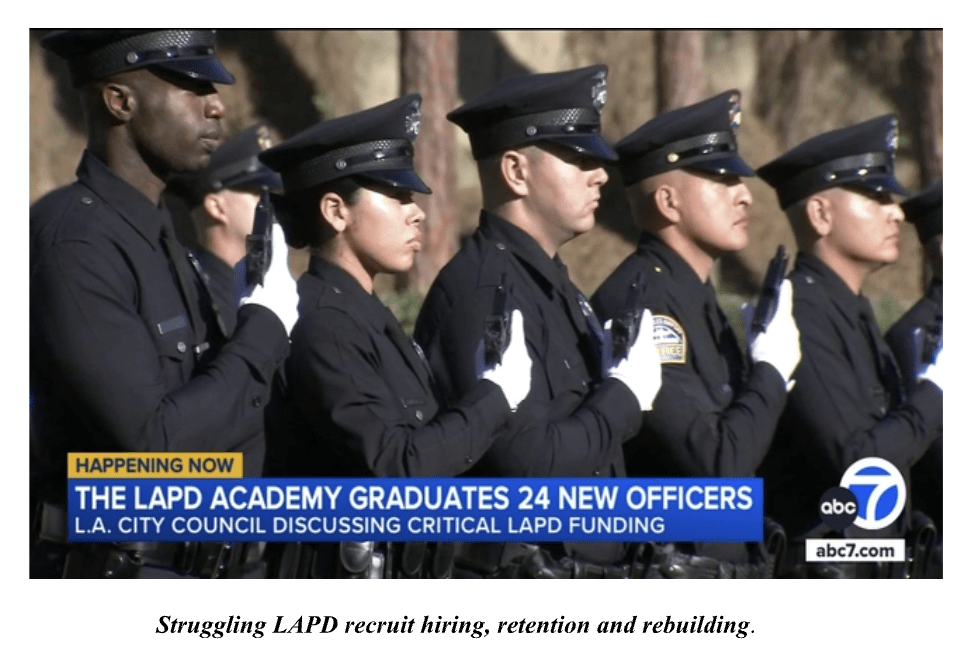 For the 2025–2026 fiscal year, the Los Angeles City Council and Mayor Karen Bass initially authorized a hiring plan for up to 410 new recruits. However, earlier this month Bass openly retracted her goal of increasing the department size, Reality is hiring is essentially a “treadmill” effect intended to offset constant attrition. As of early April 2026, the LAPD has approximately 8,677 sworn personnel.