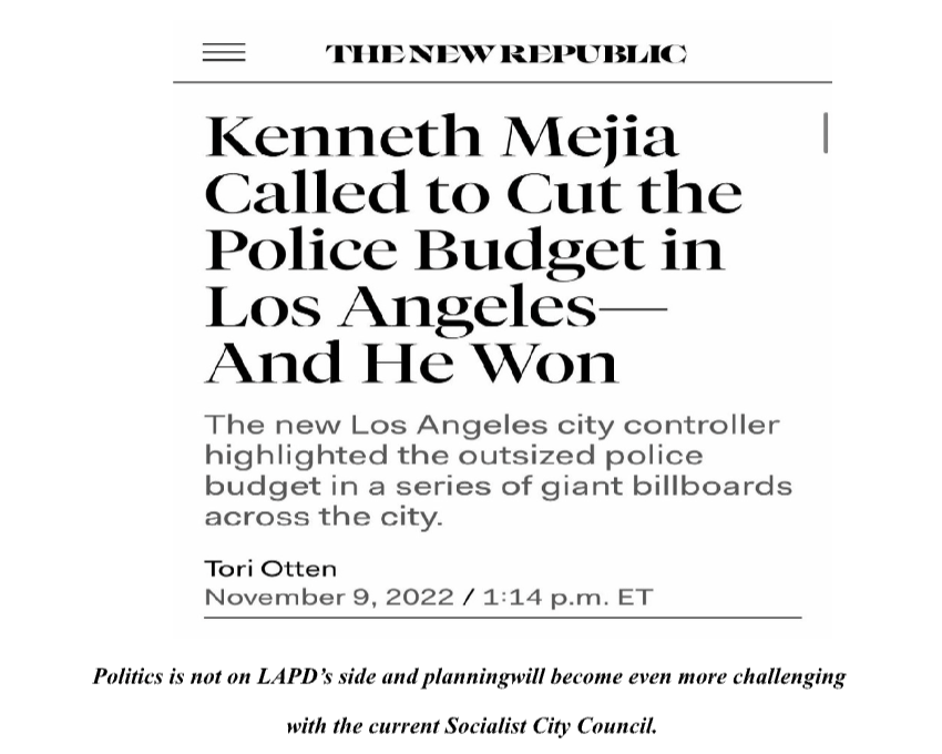 The logistical crisis extends to the department’s facilities and technology. Under the Mayor’s Office of Public Safety, leadership remember Brian Williams (bomb caller) who ignored the critical cries of both LAPD and LAFD for the need of a flip the switch command post to run Operations. Instead, they handed the recommended site which could have housed a state-of-the-art Command Operations Center over to Sanitation to house trash trucks.