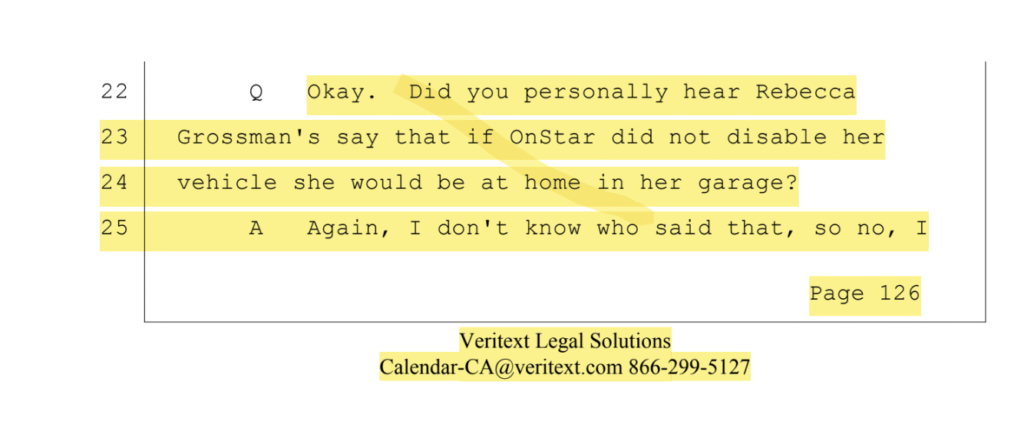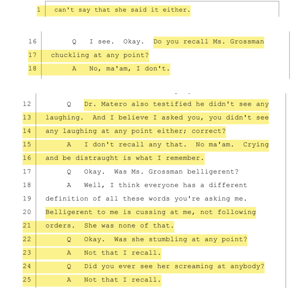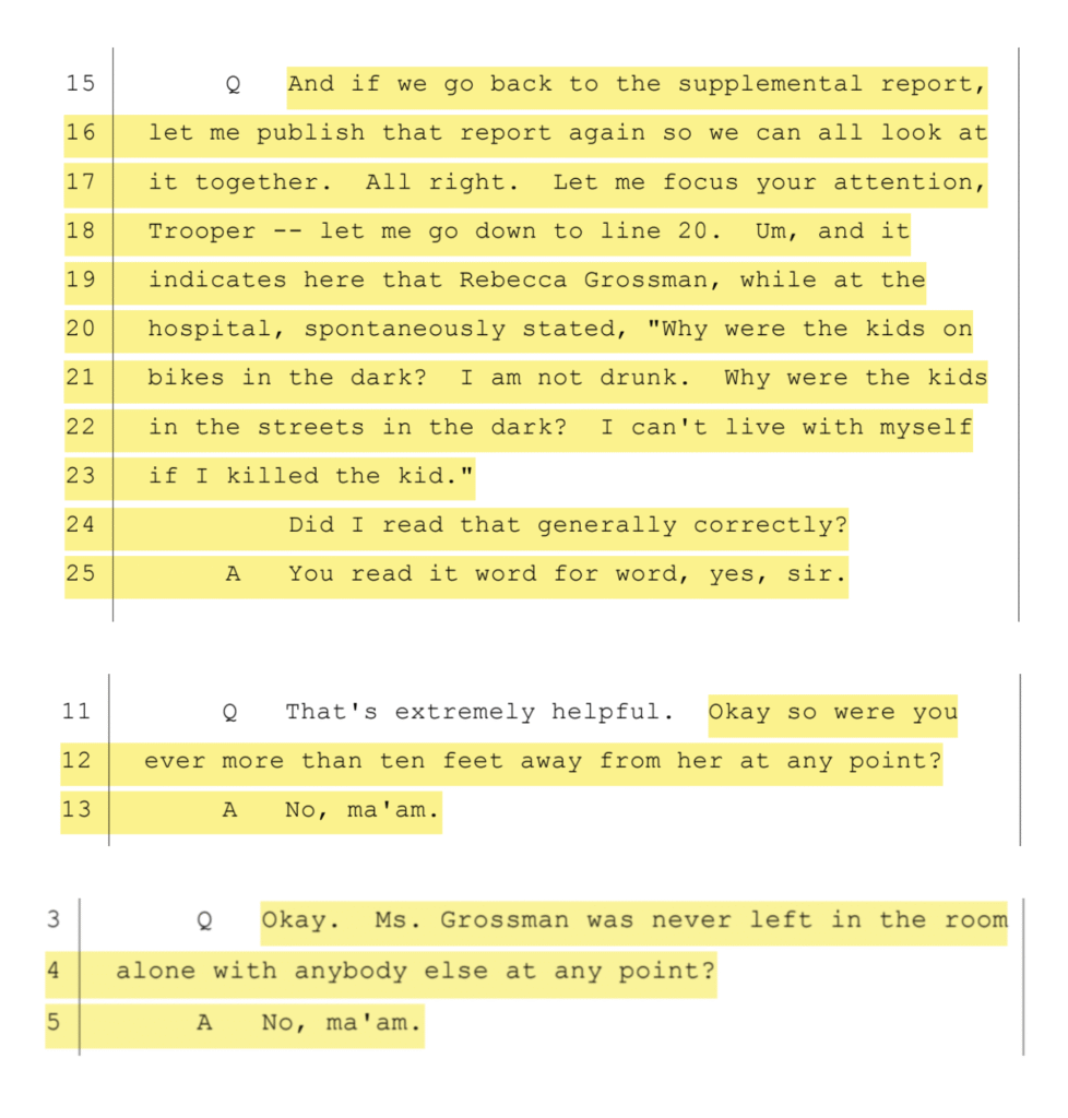 The sheriff’s deputy who escorted Grossman continuously from the crash scene to the hospital testified that he never heard any such statement. His presence with Grossman was uninterrupted. This direct contradiction was never meaningfully presented to the jury, depriving them of critical context for assessing the credibility of the prosecution’s central malice evidence.