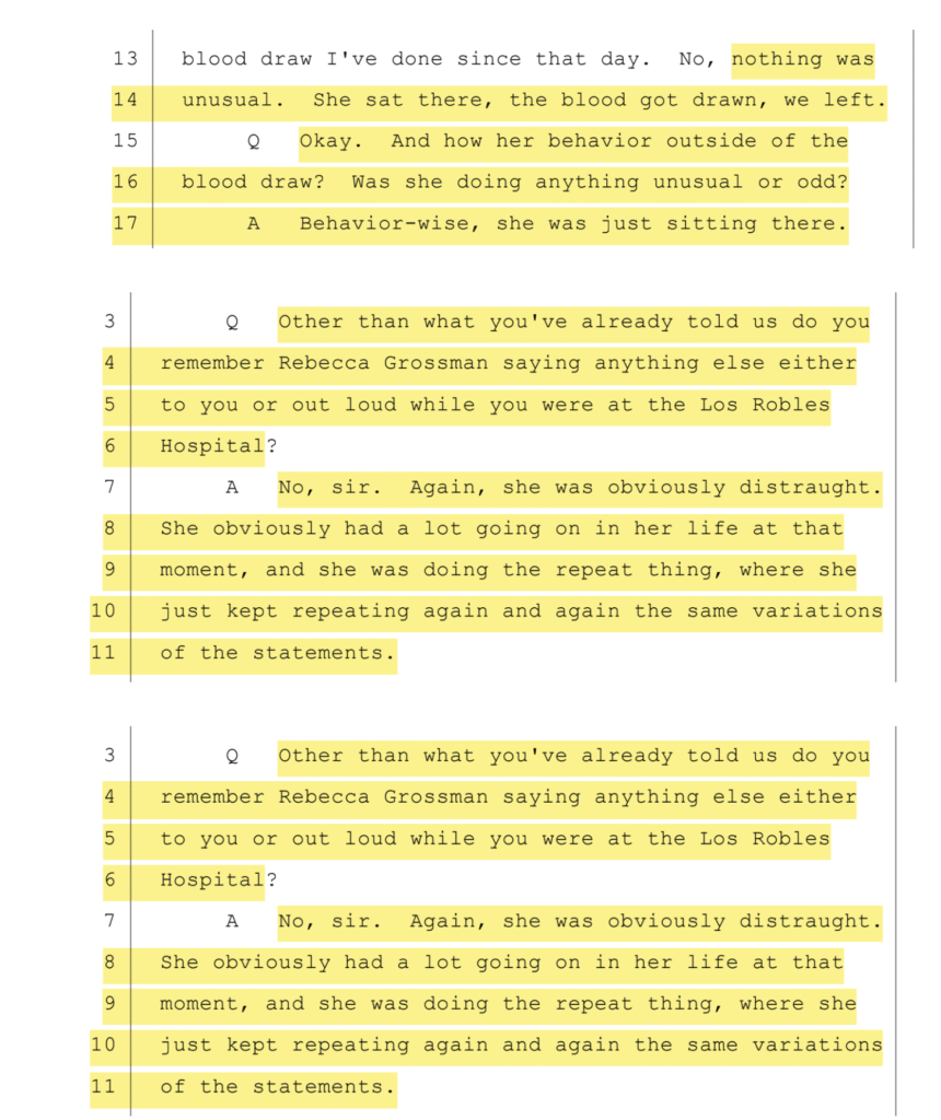 The prosecution’s implied malice argument rested almost entirely on a single alleged statement attributed to Grossman by a hospital technician suggesting she would have been home if not for the incident, which prosecutors framed as evidence of callous indifference.
