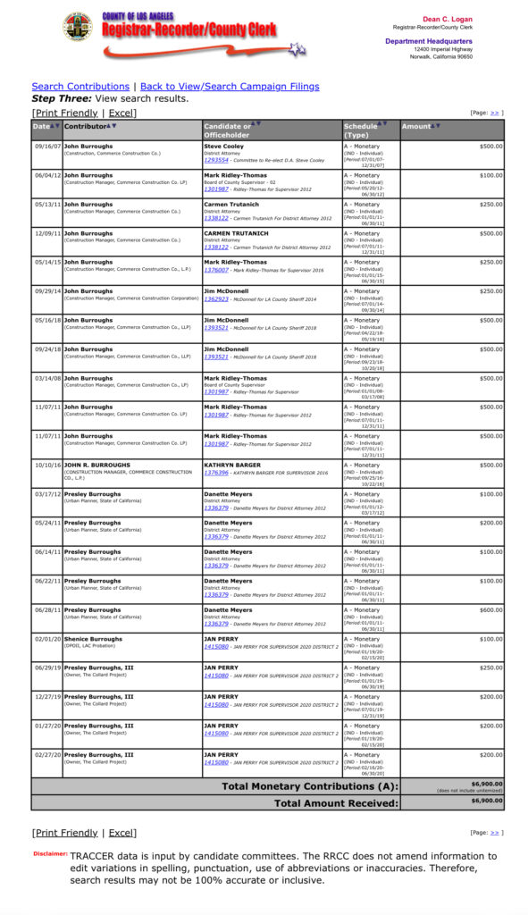 Follow the money and the timeline tells the story: Majestic’s donations were never random, they were precise, deliberate transactions strategically timed around major County decisions. Records from the LA County Registrar show a steady escalation: $9,000 from 2007 to 2012, $26,700 through 2018, and then a massive $152,500 surge from 2018 through 2023 targeting Supervisors, Assessors, DAs, and Sheriffs. The Roski family, Edward Jr., Gayle, Patricia Reon, Michael, and Raymond, fed the machine, often listing Majestic as their employer. Commerce Construction, a Roski-affiliated firm, sweetened the pot with another $9,000.